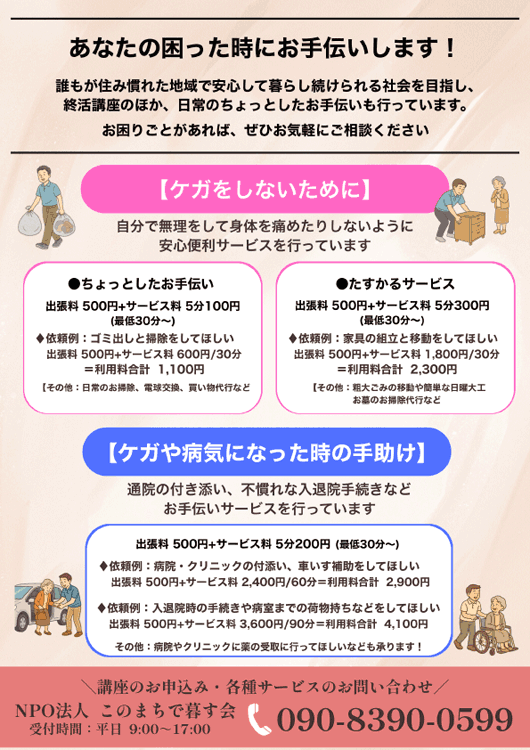 手助けをするボランティア精神に富んだメンバーの「時間とお金」の持ち出しで、なんとか安い利用料で、所得が少ない方の介護保険等公助ではできない部分を支援し、生活を支えてきたわけですから。